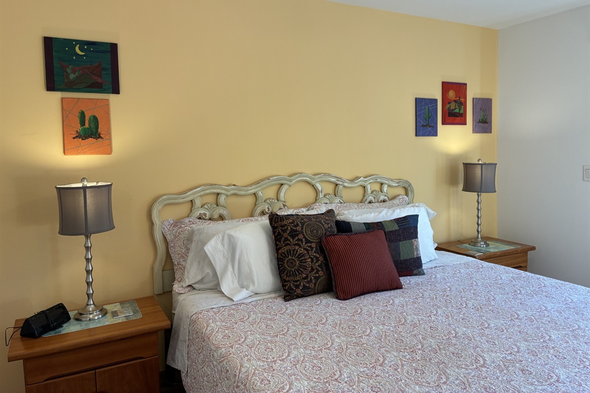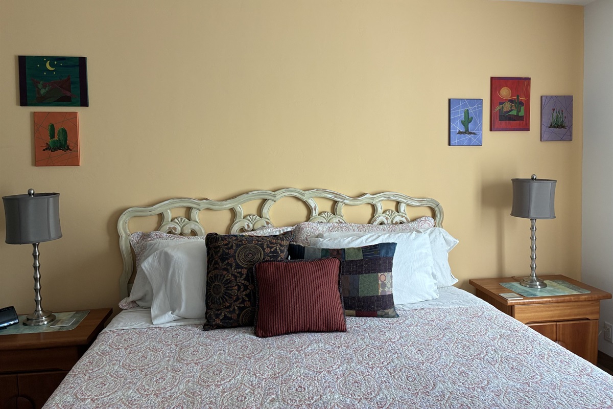 2 Bedrooms • 1 Bathroom 1 Bath • Sleeps 1-4State Tax #21272215 This is a smoke free property. Convenient location, near midtown Tucson. Casita K (800sf) is part of a 15 unit apartment complex where all units are situated around a pool. It has a fenced in yard for privacy and carefully chosen furnishings for your comfort and enjoyment. Both bedrooms have king size beds with linens and coordinated decor, the living room has leather furniture, a flat screen tv, and the kitchen is fully stocked with cooking and dining utensils. A washer and dryer are located in the casita as well. The property is centrally located to all of Tucson's tourist attractions, the University of Arizona and area hospitals. We do provide free secure parking in our gated parking lot for one car per casita. All parking is in assigned parking spaces. Traveling with a second vehicle, they are able to park on the street outside the complex, or if available we do have a few additional parking spaces for rent at $10 per night extra. Dogs up to 60 pounds allowed provided they are not a 'pit bull or pit bull mix', do not bark, and are not left in the unit alone unless crated. There is a limit of 2 dogs per unit. NO OTHER TYPES OF PETS.